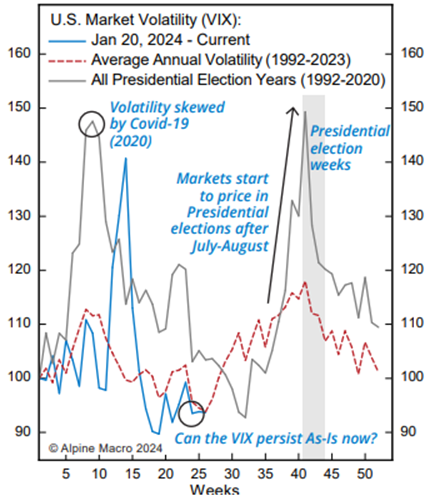 Generally, the rule of thumb for the U.S. election is that the market doesn’t really respond until around 60 days prior to the election date. That would mean that around early September, the markets would seem to care more. As the chart below from Alpine Macro shows, in a typical U.S. election year, the implied volatility (think of this as the cost of insurance) starts to escalate rapidly in the 10 weeks leading up the election. This is more a statement around market participants demand for hedging and their uncertainty concerns.